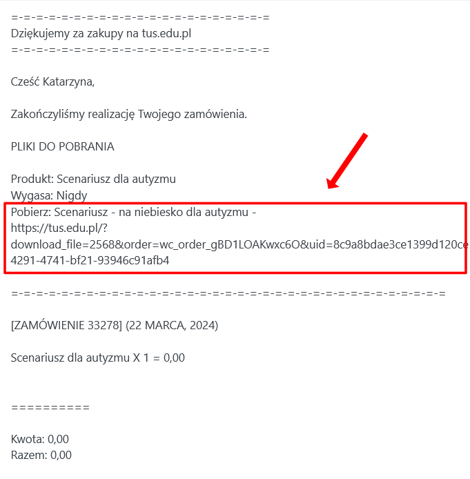 Po złożeniu zamówienia zostanie również wysłana wiadomość email o temacie "Twoje zamówienie zostało zrealizowane". W tej wiadomości znajduje się link do pobrania zamówionych plików.