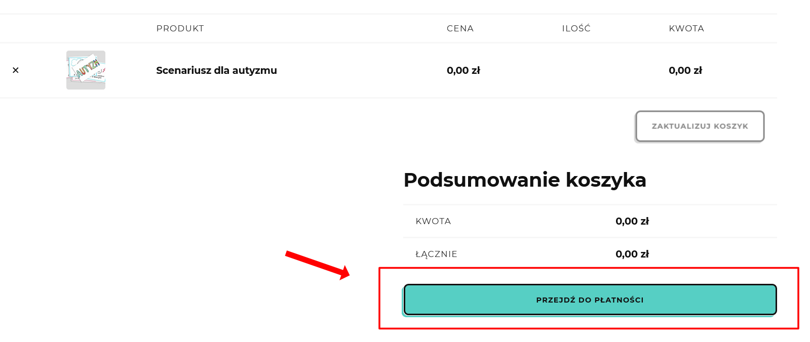 2. Następnie należy kliknąć na przycisk "Przejdź do płatności". Bez obaw, nie zostaną pobrane żadne opłaty. Opisy przycisków są uniwersalne dla calego sklepu.