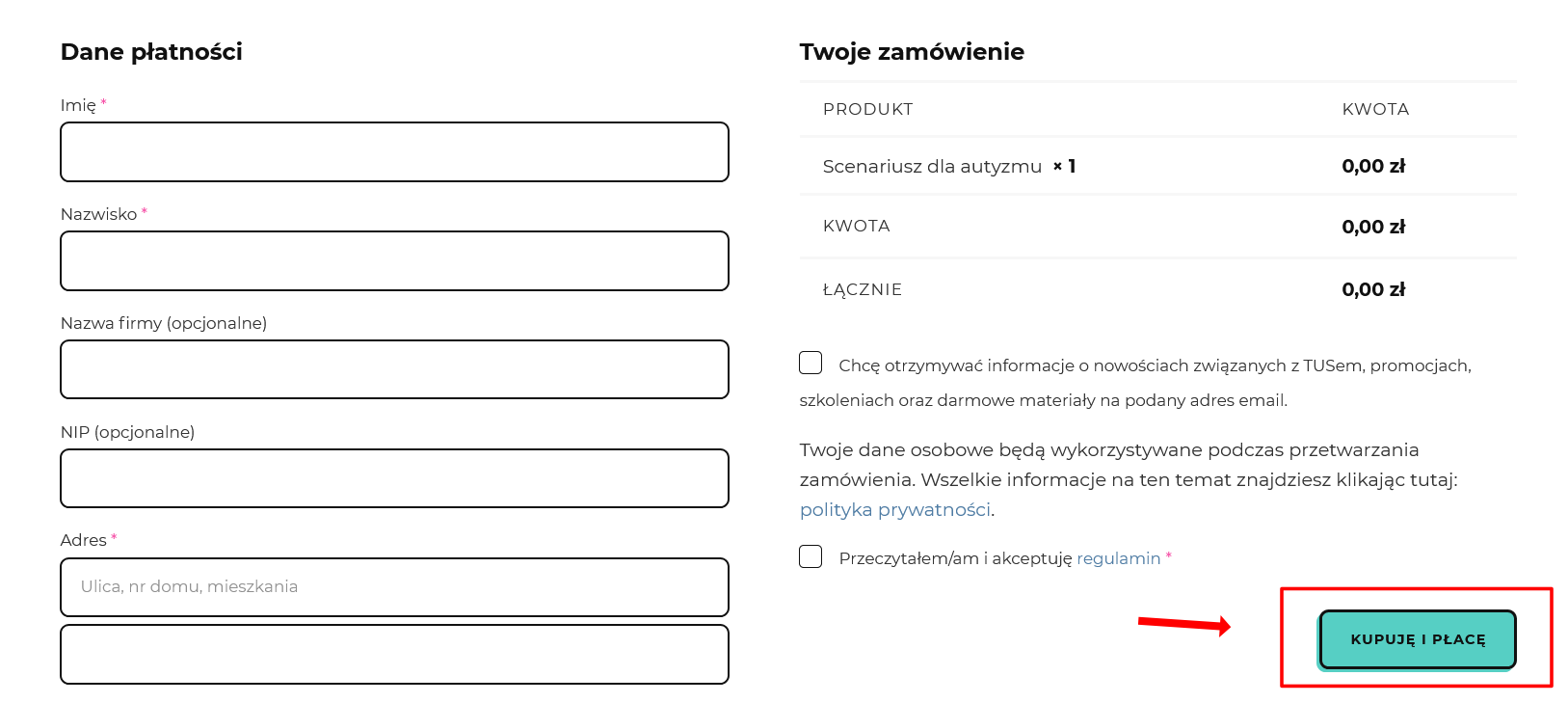 (w przypadku darmowych materiałów nie będzie konieczności podawania żadnych danych płatniczych i zamówienie zostanie od razu zrealizowane).