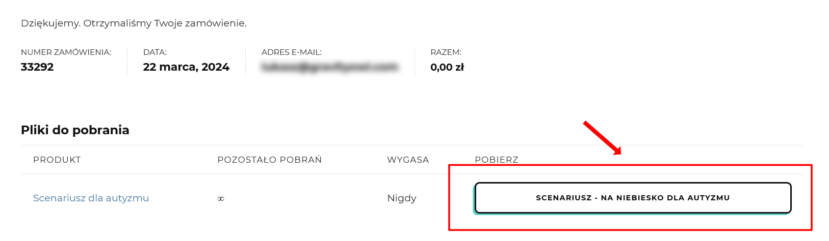 4. Materiały można pobrać klikając na przycisk znajdujący się na ekranie potwierdzającym realizację zamówienia.