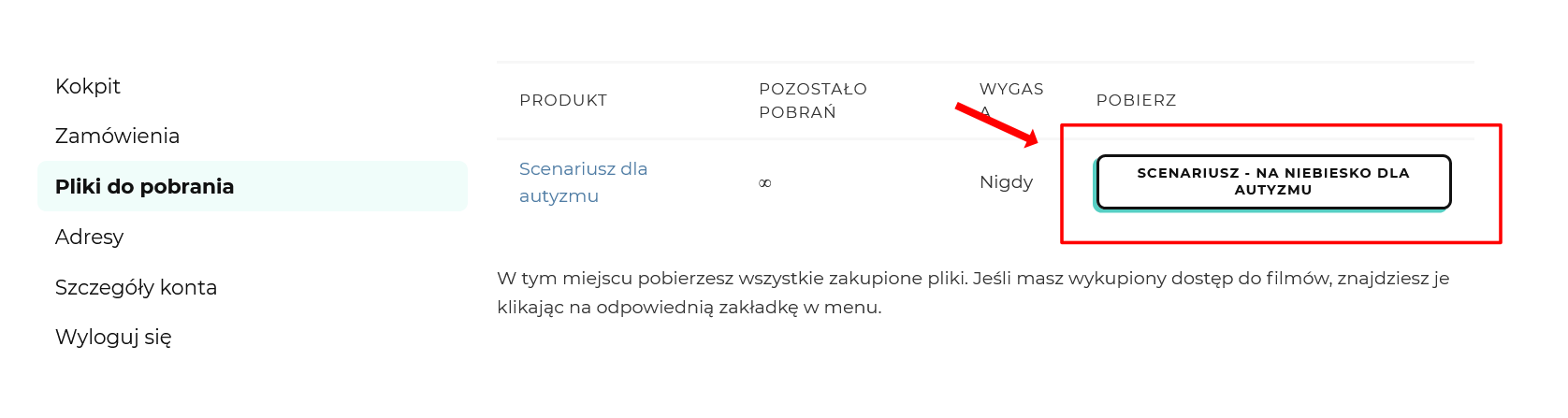 Dostęp do zamówionych plików jest też zawsze możliwy z poziomu strony "Moje konto" w zakładce "Pliki do pobrania".